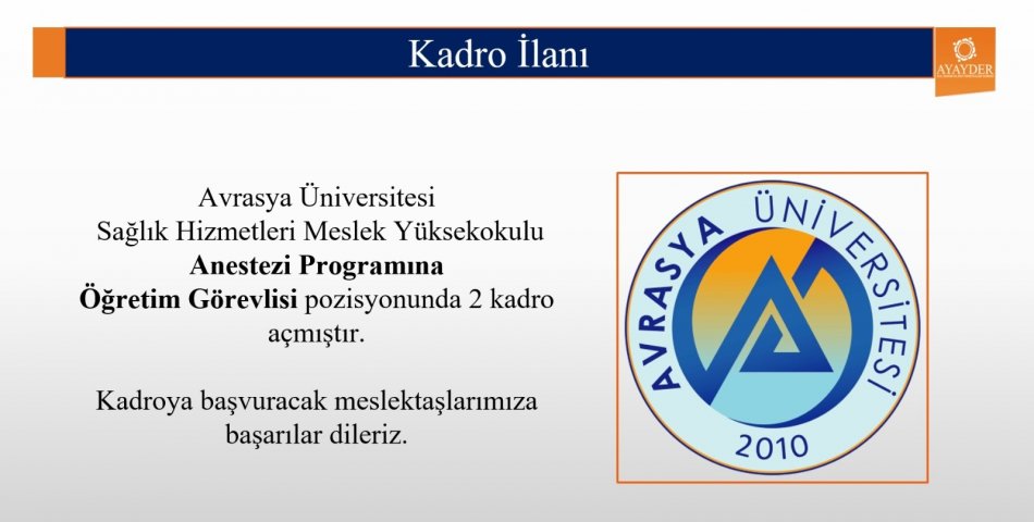 Avrasya Üniversitesi Sağlık Hizmetleri M.Y.O. Anestezi Programına Öğretim Görevlisi İlanı