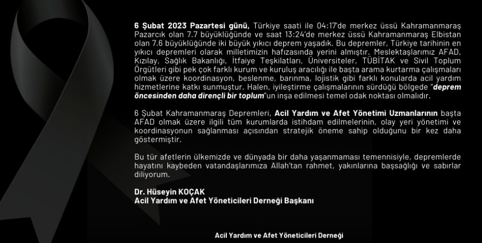 Başkanımızın 6 Şubat Kahramanmaraş Depremleri Mesajı
