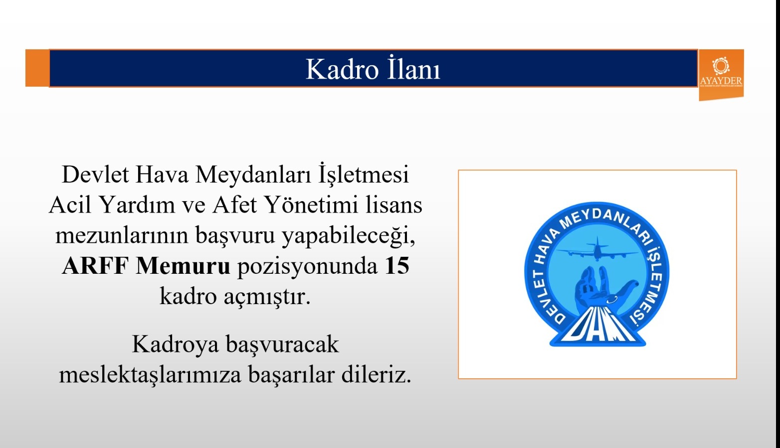 Devlet Hava Meydanları İşletmesi, Acil Yardım ve Afet Yönetimi lisans mezunlarının başvuru yapabileceği 15 ARFF Memuru kadrosu açmıştır.