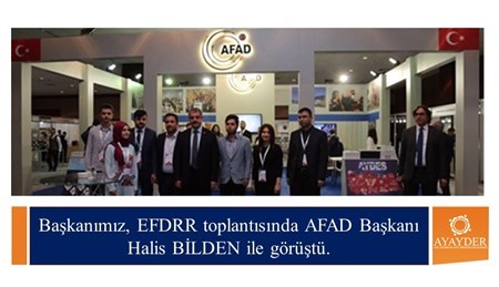 Başkanımız Arş. Gör. Hüseyin KOÇAK, European Forum For Disaster Risk Reduction/Afet Risk Azaltımı Avrupa Açık Forumunda AFAD Başkanı Mehmet Halis BİLDEN ile bir görüşme gerçekleştirdi. Görüşmeye AYAYDER İzmir İl Temsilcisi Arş. Gör. Mehmet CİNOÇEVİ, ÇOMÜ Afet Eğitim Topluluğu Başkanı Ayşe Şükran KARAGÖZ, Başkan Yardımcısı Kübra KARABELA, Yönetim Kurulu Üyeleri Yasin VURANKAYA ve Sefa YÜKSEK katılmıştır. Görüşmede Acil Yardım ve Afet Yönetimi mezunlarının AFAD ve diğer ilgili birimlerinde istihdamına yönelik çalışmalar konuşulmuştur.