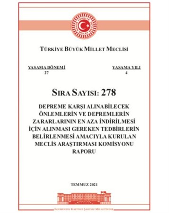 Depreme Karşı Alınabilecek Önlemlerin Ve Depremlerin Zararlarının En Aza İndirilmesi İçin Alınması Gereken Tedbirlerin Belirlenmesi Amacıyla Kurulan Meclis Araştırma Komisyonu Raporu Yayınlandı. 09 Ağustos 2021, 21:57