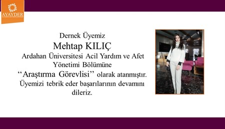 Dernek üyemiz Dr. Mehtap KILIÇ YILDIZ Ardahan Üniversitesi Sağlık Bilimleri Fakültesi Acil Yardım ve Afet Yönetimi bölümüne Doktor Öğretim üyesi olarak atanmıştır.