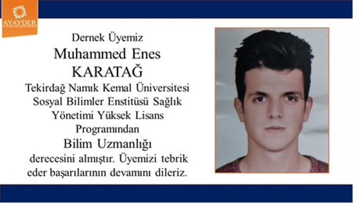 Dernek Üyemiz Muhammed Enes KARATAĞ Tekirdağ Namık Kemal Üniversitesi Sosyal Bilimler Enstitüsü Sağlık Yönetimi Yüksek Lisans Programından Bilim Uzmanlığı derecesini almıştır. 09 Ağustos 2021, 21:54