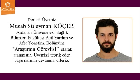 Dernek Üyemiz Musab Süleyman KÖÇER Ardahan Üniversitesi Sağlık Bilimleri Fakültesi Acil Yardım ve Afet Yönetimi Bölümüne ‘‘Araştırma Görevlisi’’ olarak atanmıştır. Üyemizi tebrik eder, akademik çalışmalarında başarılar dileriz.