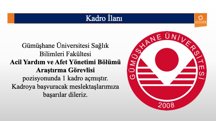 Gümüşhane Üniversitesi Sağlık Bilimleri Fakültesi Acil Yardım ve Afet Yönetimi Bölümü Araştırma Görevlisi pozisyonunda 1 kadro açmıştır. Kadroya başvuracak meslektaşlarımıza başarılar dileriz. İlana buradan ulaşabilirsiniz.
