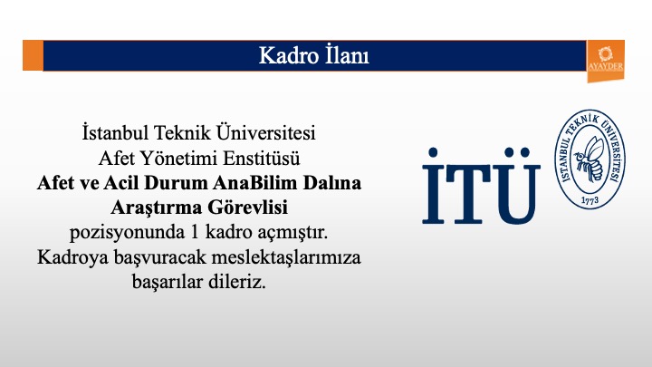 İstanbul Teknik Üniversitesi Afet Yönetimi Enstitüsü Afet ve Acil Durum Anabilim Dalına Araştırma Görevlisi pozisyonunda 1 kadro açmıştır. Kadroya başvuracak meslektaşlarımıza başarılar dileriz. İlanana buradan ulaşabilirsiniz.