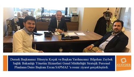 Dernek Başkanımız Hüseyin Koçak ve Başkan Yardımcımız Bilgehan Zeybek Sağlık Bakanlığı Yönetim Hizmetleri Genel Müdürlüğü Stratejik Personel Planlama Daire Başkanı Ercan SAPMAZ 'a resmi ziyaret gerçekleştirdi.