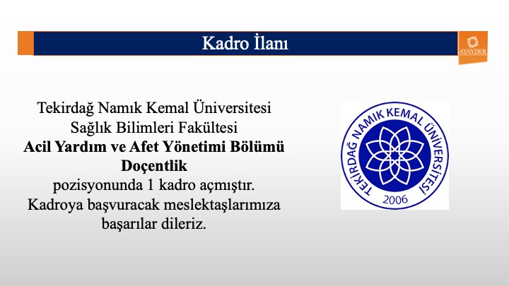 Tekirdağ Namık Kemal Üniversitesi Sağlık Bilimleri Fakültesi Acil Yardım ve Afet Yönetimi Bölümü Doçentlik pozisyonunda 1 kadro açmıştır. Kadroya başvuracak meslektaşlarımıza başarılar dileriz. buradan ulaşabilirsiniz.