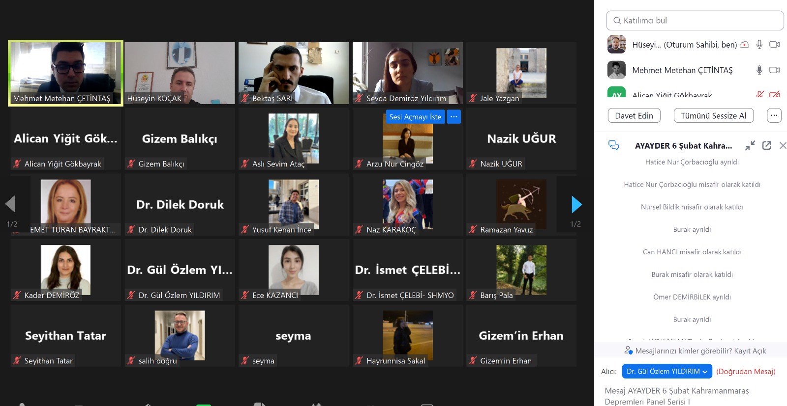 AYAYDER WEBINAR 1 serisi kapsamında 6 Şubat Kahramanmaraş Depremleri Paneli gerçekleştirildi. Çanakkale Onsekiz Mart Üniversitesi, Acil Yardım ve Afet Yönetimi bölümü Dr. Öğretim Üyesi Hüseyin Koçak moderatörlüğünde Ege Üniversitesi’nden Dr. Öğr. Gör. Bektaş Sarı “Kahramanmaraş Depremlerinde Koordinasyon Çalışmalarına Yönelik Saha Gözlemleri” başlıklı konuşmasını ve Amasya Üniversitesi’nden Dr. Öğr. Üyesi Sevda Demiröz Yıldırım “Kahramanmaraş Merkezli Depremlerde Çadırkent Kuruluşundaki Deneyimler” başlıklı konuşmasını gerçekleştirmiştir. Dr. Öğr. Gör. Bektaş Sarı konuşmasında depremlerde koordinasyonun ve kriz iletişiminin önemine vurgu yaparak sahadaki gözlemlerini aktarmıştır. Dr. Öğr. Üyesi Sevda Demiröz Yıldırım konuşmasında çadırkent kuruluşundaki önemli noktalara vurgu yaparken saha deneyimlerini aktarmıştır.