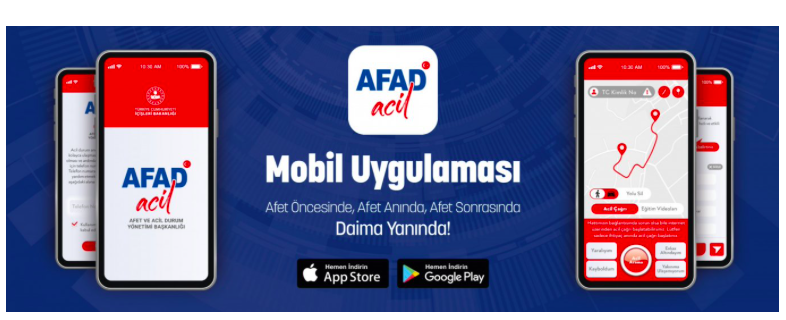 Acil Durum ve Afet Müdürlüğü Başkanlığı'nın vatandaşlar için afet öncesinde, afet anında ve afet sonrasındaki ihtiyaçlarını tek uygulamada karşılamak amacıyla AFAD Acil mobil uygulaması geliştirmiştir. Tüm IOS ve Android kullanıcılarının yararlanabileceği uygulama, App Store ve Google Play uygulama mağazalarından indirilebiliyor. ayrıntılı bilgiye linkten ulaşabilirsiniz.