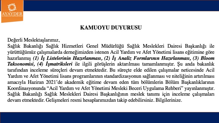 Değerli meslektaşlarımız, Sağlık Bakanlığı Sağlık Hizmetleri Genel Müdürlüğü Sağlık meslekleri Dairesi Başkanlığı ile yürüttüğümüz çalışmalarda derneğimizden istenen Acil Yardım ve Afet Yönetimi lisans eğitimine göre hazırlanmış (1) İş Lİstelerinin Hazırlanması, (2) İş Analiz Formlarının Hazırlanması, (3) Bloom Taksonomisi, (4) İş Matriksleri ile ilgili görüşlerin aktarılması tamamlanmıştır. Şu anda bakanlık tarafından inceleme süreçleri devam etmektedir. Bu süreçte elde edilen çalışmalar neticesinde Acil Yardım ve Afet Yönetimi lisans programlarının standardizasyonun sağlanması ve niteliğinin arttırılması amacıyla Haziran 2021'de akademik eğitime devam eden tüm bölümlerin Bölüm Başkanlıklarının Koordinasyonunda "Acil Yardım ve Afet Yönetimi Mesleki Beceri Uygulama Rehberi" yayınlanmıştır. Sağlık Bakanlığı Sağlık Meslekleri Dairesi Başkanlığının meslek tanımı için inceleme çalışmaları devam etmektedir. Gelişmeleri resmi hesabımızdan takip edebilirsiniz. Bilgilerinize